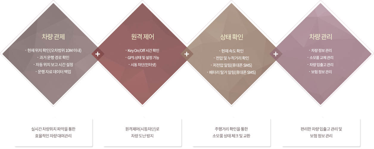 차량관제 서비스와 소모품 관리, 차량 입출고 관리, 보험정보 관리등 유비칸R의 차량관제 서비스는 PC와 모바일 시스템을 병행, 렌터카 관리에 최적화된 다양한 관제 솔루션 제공합니다.