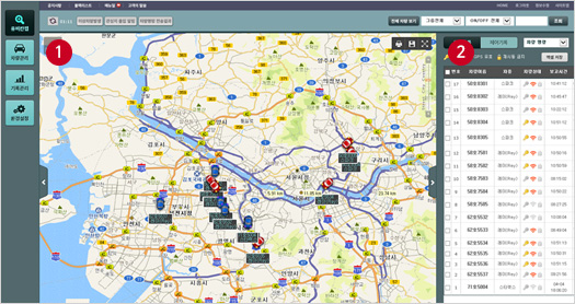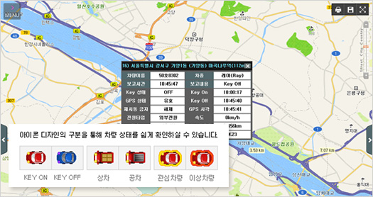 - 전체 차량의 운행현황을 이미지 맵 상에서 한눈에 확인 가능