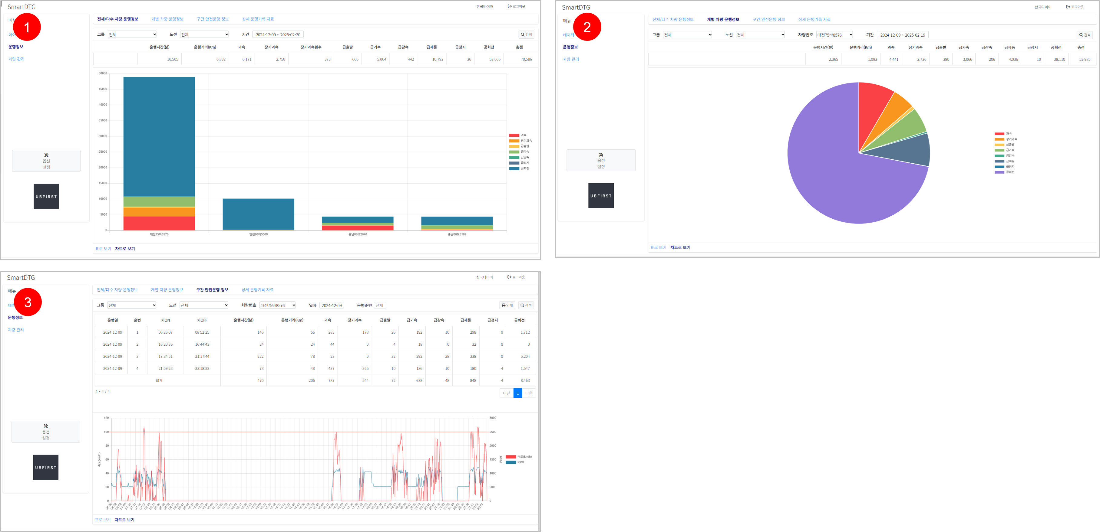 - ① 전체/ 다수 차량 운행 정보 ② 개별 차량 운행 정보 ③ 구간 안전 운행 정보